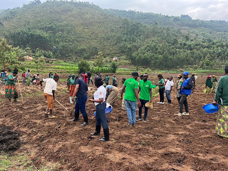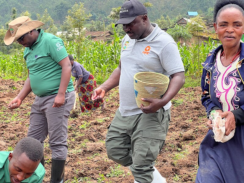 Guverineri w'Intara y'Amajyaruguru MUGABOWAGAHUNDE Maurice ari kumwe n'Umuyobozi Mukuru wungirije w'ikigo cy'Igihugu gishinzwe gutezimbere ubuhinzi n'ubworozi RAB, Dr UWAMAHORO Florence n'abandi bayobozi bafatanyije n'abahinzi bo mu mirenge ya Cyungo na Rukozo ikora kuri iki shanga gutera imbuto y'ibigori aho bateye ku buso bungana na hegitare 74.