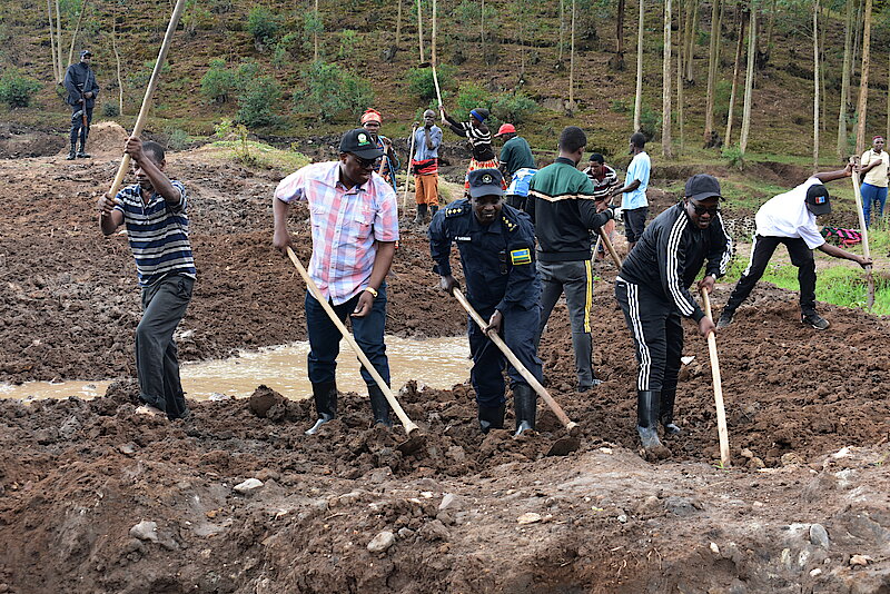 Umuyobozi w'Akarere wungirije ushinzwe ubukungu Bwana RUGERINYANGE Theoneste ari kumwe n’inzego z’umutekano zikorera mu Karere; yifatanyije n'abaturage b'imirenge ya Base na Cyungo, mu bikorwa byo gusubiranya igishanga cya Gatovu giherereye mu Kagari ka Cyohoha, mu Murenge wa Base, cyangijwe n'ibikorwa by'ubucukuzi bw'amabuye y'agaciro bwakorewe muri icyo gishanga mu buryo butemewe.