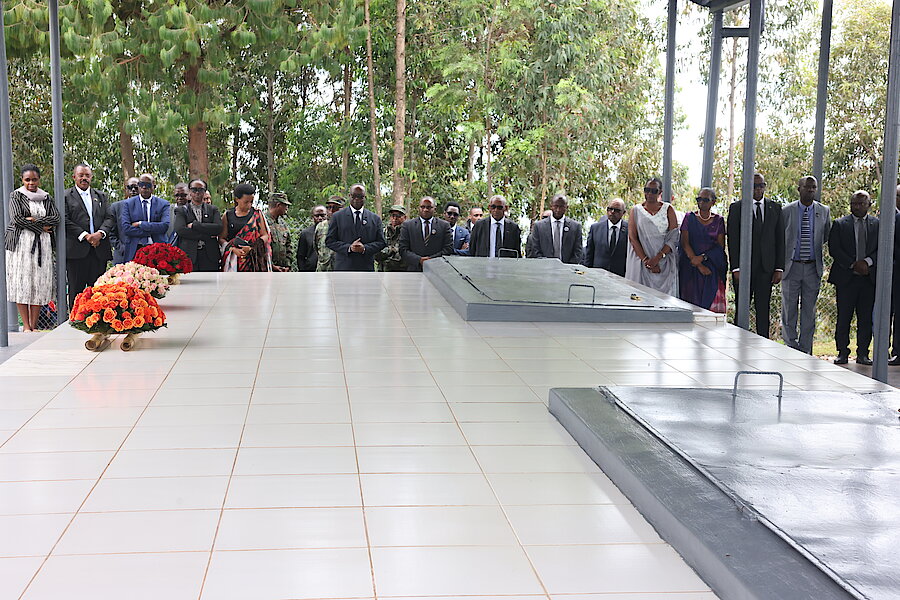 Hon KAZARWA Gertrude Perezida w'Inteko Ishingamategeko y'u Rwanda hamwe n'Abadepite bagize inteko Ishingamategeko bunamiye imibiri ishyinguye mu rwibutso rwa Jenoside Yakorewe Abatutsi rwa Mvuzo
