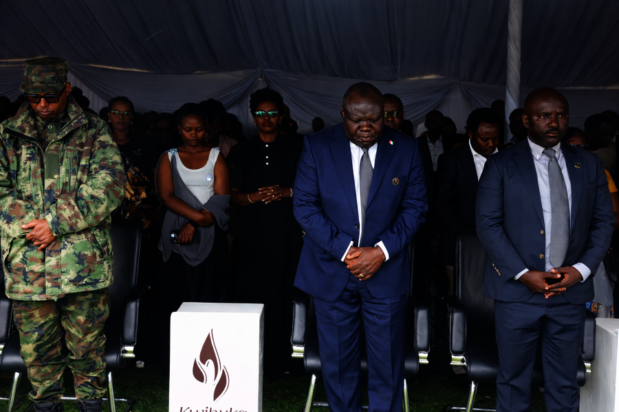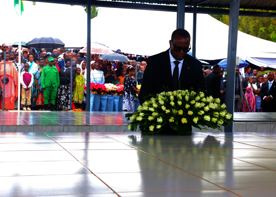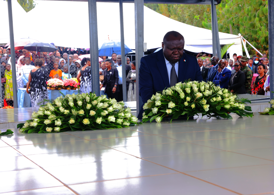 Dr. BIZIMANA Jean Damascenie Minisitiri w'Ubumwe bw'Abanyarwanda n'Inshingano Mboneragihugu yunamiye inzirikarengane zishyinguye mu Rwibutso rwa Jenoside Yakorewe Abatutsi rwa Mvuzo.