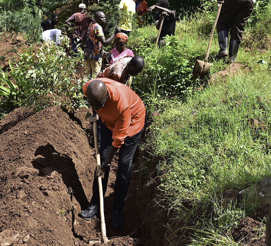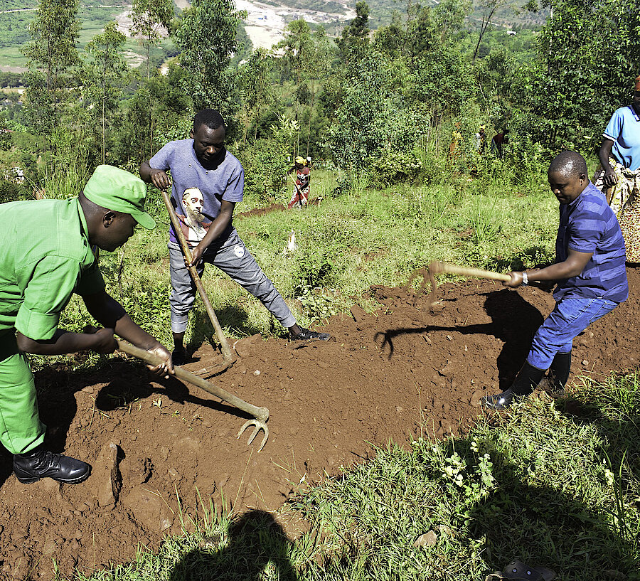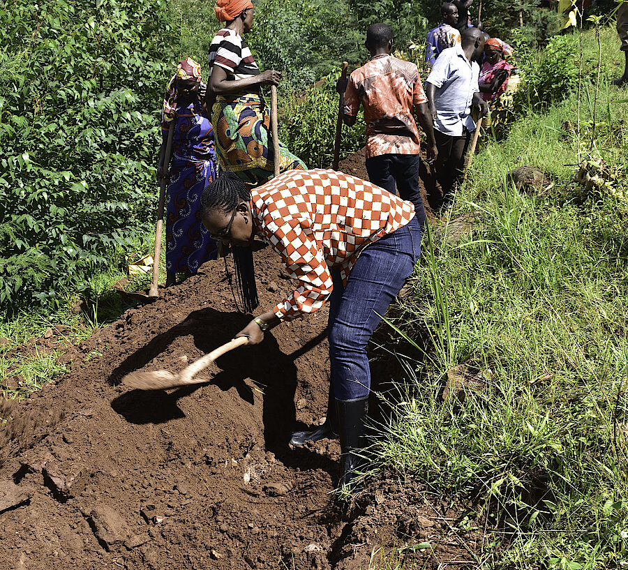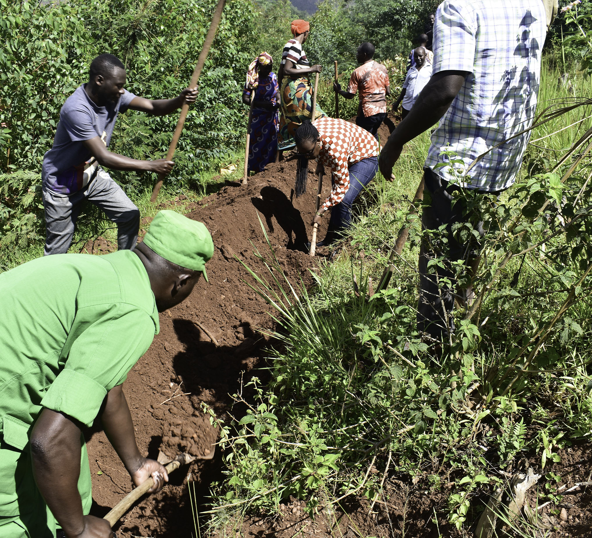 umuyobozi w’Akarere Madamu Mukanyirigira Judith hamwe n’abagize inama y’umutekano itaguye n'umuyobozi ushinzwe imirimo rusange NSANZAMAHORO Ereneste bifatanyije n'abaturage bo mu murenge wa Shyorongi mu kagari ka Muvumu mu muganda wo gucukura imirwanyasuri mu rwego rwo gukumira ibiza biterwa n'imvura.